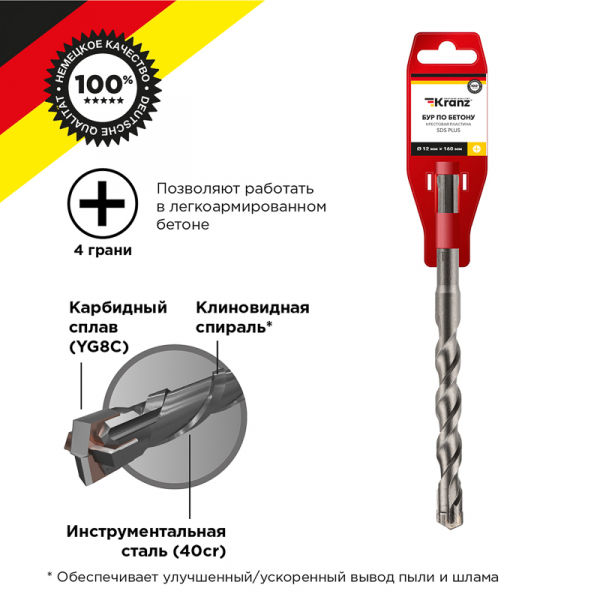 Бур по бетону 12x210x150 мм SDS PLUS Kranz