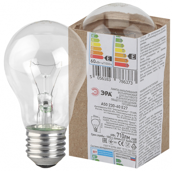Лампа накаливания A50 (груша) 60Вт 230В Е27 в гофре ЭРА /100