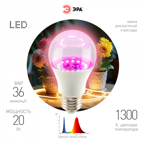Фитолампа для растений светодиодная ЭРА FITO-20W-Ra90-E27 полного спектра 20 Вт Е27
