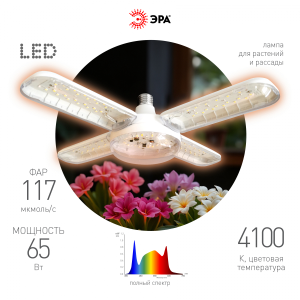 Фитолампа для растений светодиодная ЭРА GREEN LINE ФИТО-65W-PFR-E27-GR 5-ти лепестковая полного спек