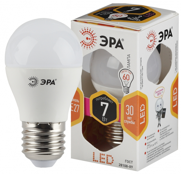 Лампа светодиодная (LED) «шар» d45мм E27 270° 7Вт 170-265В матовая тепло-белая 2700К ЭРА (Энергия света)