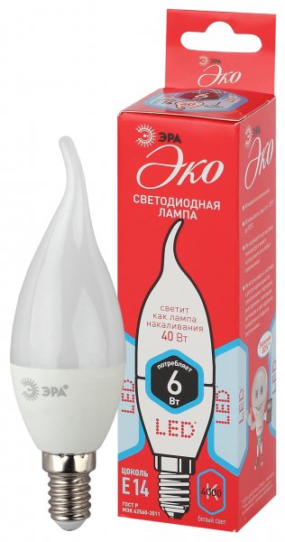 Лампа светодиодная (LED) «свеча» d37мм E14 100° 6Вт 220-240В матовая нейтральная холодно-белая 4000К ЭРА (Энергия света)