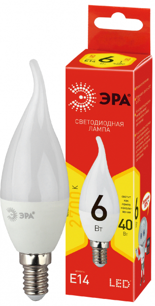 Лампа светодиодная (LED) «свеча» d37мм E14 100° 6Вт 220-240В матовая тепло-белая 2700К ЭРА (Энергия света)
