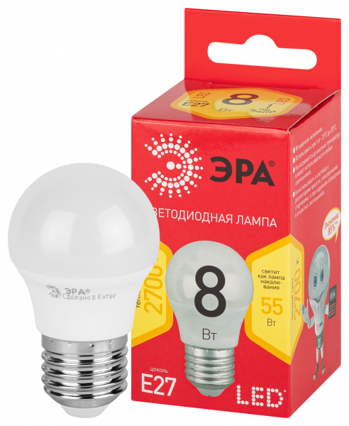 Лампа светодиодная (LED) «шар» d45мм E27 270° 8Вт 220-240В 2700К ЭРА (Энергия света)