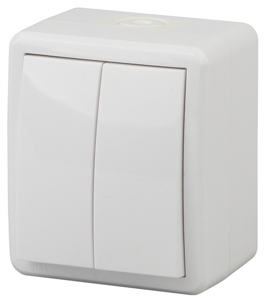 Выкл 2-клавиш. мех-м с накладкой 10А 250В о/у белый глянц. декор d 1/1 IP54 ЭРА Эра Эксперт