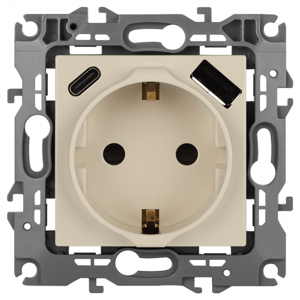 Розетка ЭРА Elegance 14-4108-02 2P+E 16A-250В со шторками с USB type-A+C 5В-3А слоновая кость