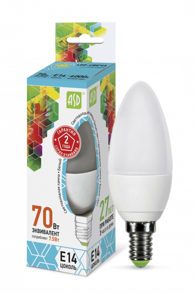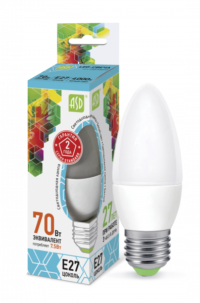 Лампа LED ASD C37 7,5W 220V 4000К E27 Standart 10/50