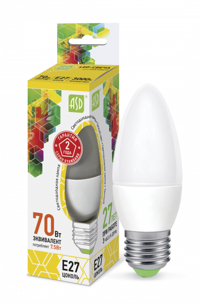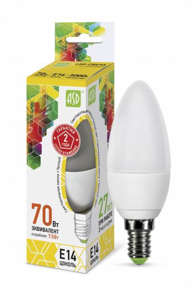 Лампа LED ASD C37 7,5W 220V 3000К E27 Standart 10/50