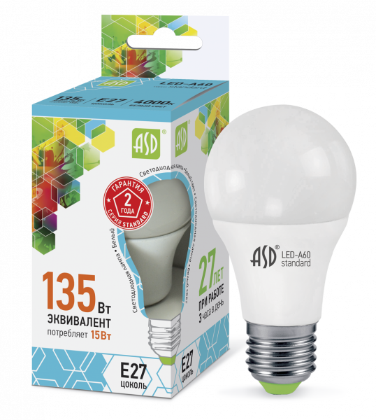 Лампа LED ASD А60 15W 220V 4000К Е27 Standard 10/50