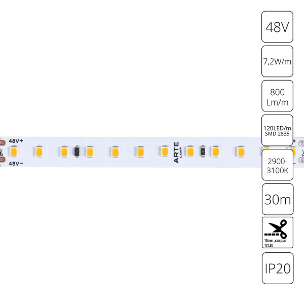 Светодиодная лента 48В 7.2Вт/м 800Лм/м 3000К 90+ 10мм SMD2835 120шт/м 30м IP20 ArteLamp