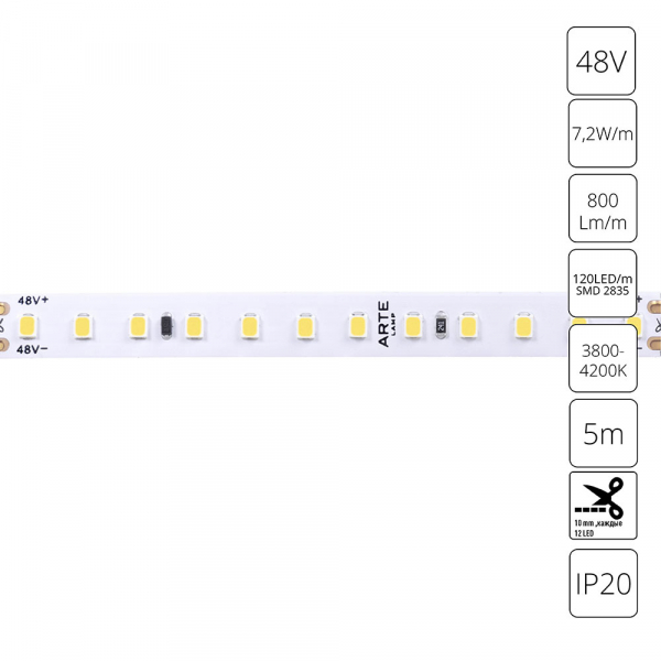 Светодиодная лента 48В 7.2Вт/м 800Лм/м 4000К 90+ 10мм SMD2835 120шт/м 5м IP20 ArteLamp