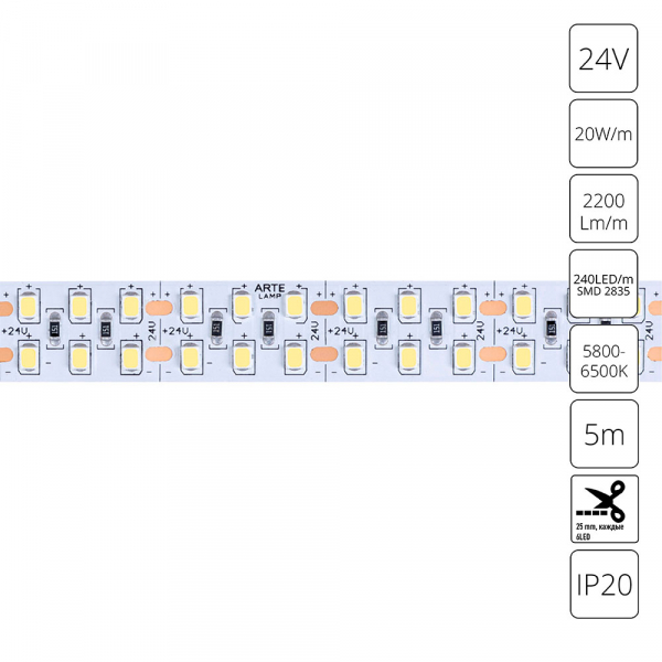 Светодиодная лента 24В 20Вт/м 2200Лм/м 6000К 90+ 15мм SMD2835 240шт/м 5м IP20 ArteLamp
