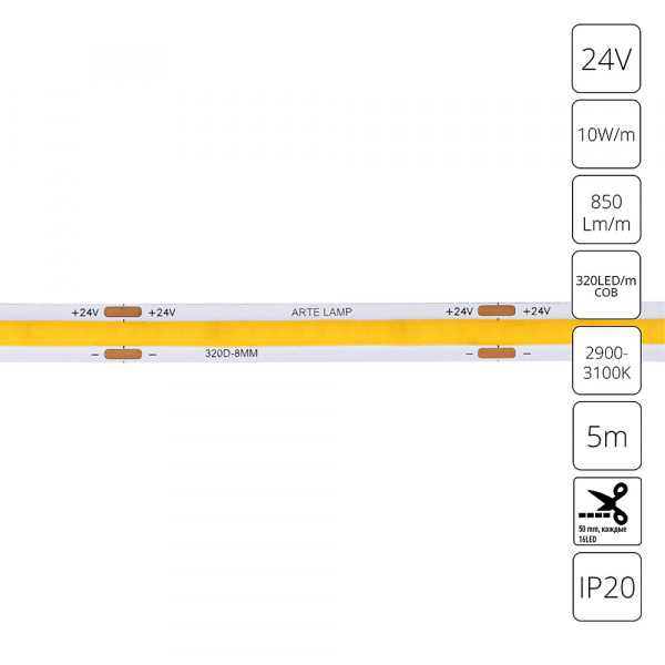 Светодиодная лента 24В 10Вт/м 850Лм/м 3000К 90+ 8мм COB 320шт/м 5м IP20 ArteLamp