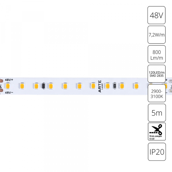 Светодиодная лента 48В 7.2Вт/м 800Лм/м 3000К 90+ 10мм SMD2835 120шт/м 5м IP20 ArteLamp