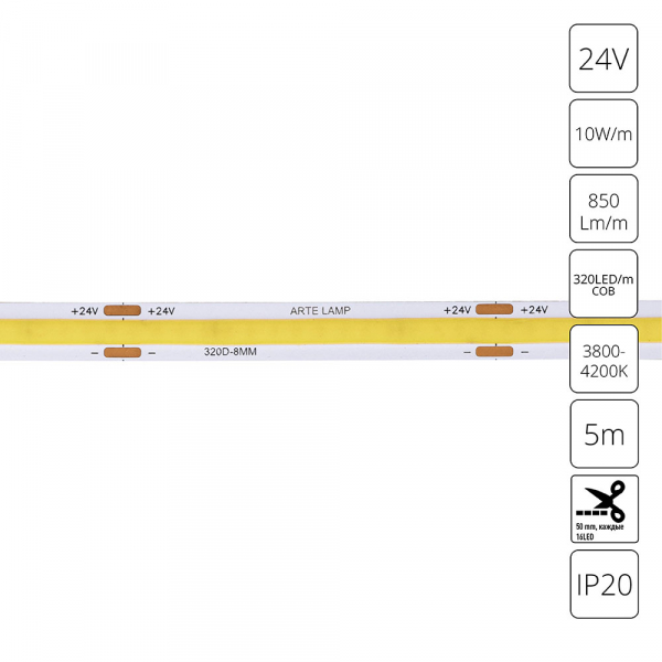 Светодиодная лента 24В 10Вт/м 850Лм/м 4000К 90+ 8мм COB 320шт/м 5м IP20 ArteLamp