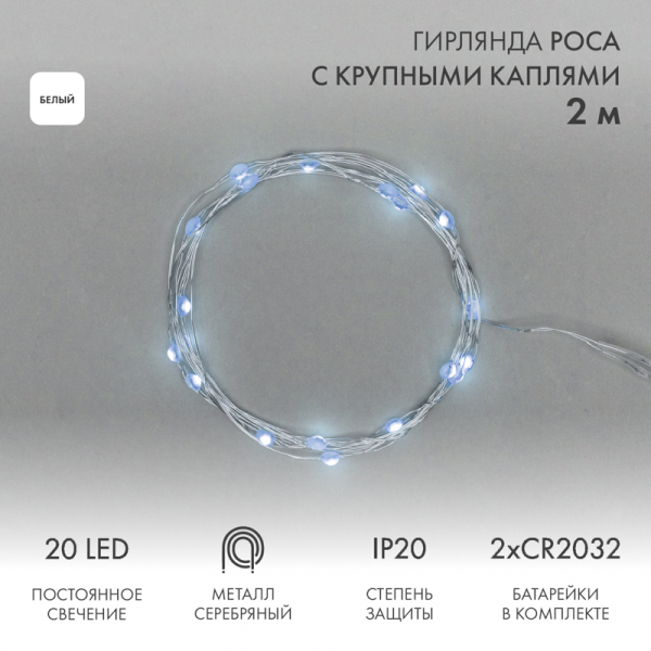 Гирлянда "Роса" с крупными каплями 2 м, 20 LED, белое свечение, 2xCR2032 в комплекте NEON-NIGHT