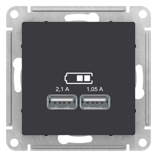 Механизм Systeme Electric (ранее Schneider Electric) серии AtlasDesign в цвете карбон розетки для зарядки с двумя разъёмами USB, с выходным напряжением 5 В постоянного тока и выходами с номинальным током по 2,1 А. USB розетка позволяет напрямую заряжать одно или два мобильных устройства. Лицевые детали из качественного ABS-пластика, устойчивого к царапинам и УФ-излучению. Благодаря покрытию «soft touch» к изделию приятно прикасаться. (ранее Schneider Electric ЭУИ UNICA NEW NU541854)