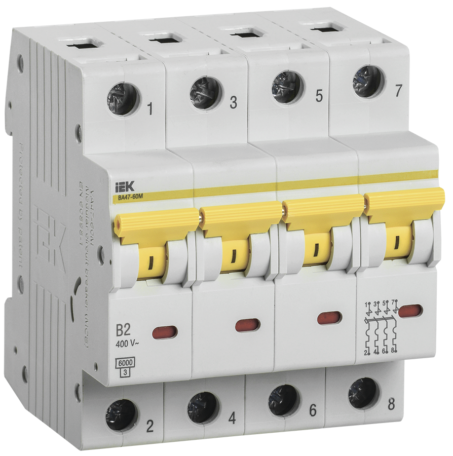 Автоматический выключатель (автомат) 4-полюсный (4P) 2А хар. B 6кА IEK (ИЭК) Выключатель Автоматический ВА 47-60
