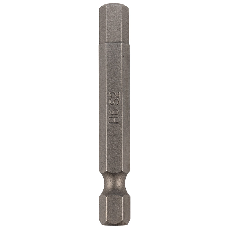 Бита HEX-6*50 мм (насадка) для закручивания крепежа (шурупы, винты). Произведена из стали S2 и закалена до оптимальной твердости, чем обусловлен высокий ресурс. Шестигранный xвостовик (Е6,3) обеспечивает быструю и надежную фиксацию в шуруповертаx. Также используется с отверткой для бит