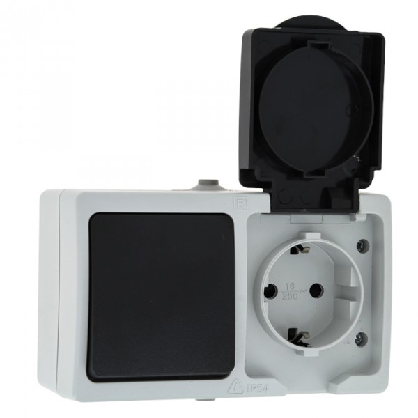 Блок комбинир-ый открыт. установки, клавишный/кнопочный 1 розетка с З/К 16А 230В пластик серый IP54 EKF Венеция Блок розетка-выключатель