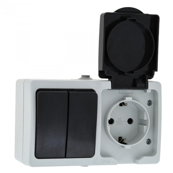Блок комбинир-ый открыт. установки, перекл. на 2 направления, клавишный/кнопочный 1 розетка с З/К 16А 230В пластик серый IP54 EKF Венеция