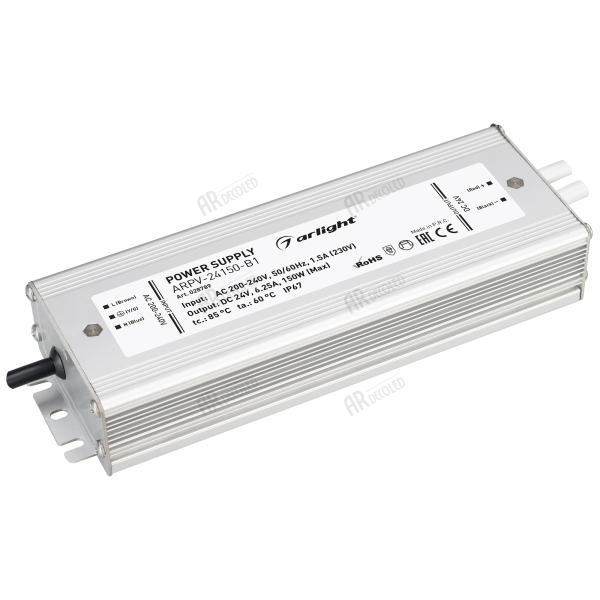 Источник напряжения с гальванической развязкой для светодиодных изделий. Входное напряжение 200-240 VAC. Выходные параметры: 24 В, 6.25 А, 150 Вт. Герметичный алюминиевый корпус IP 67. Рабочая температура -30… 50C°. Габаритные размеры длина 202 мм, ширина 67 мм, высота 34 мм. Совместим с диммерами с частотой ШИМ более 5кГц. Гарантийный срок 3 года.