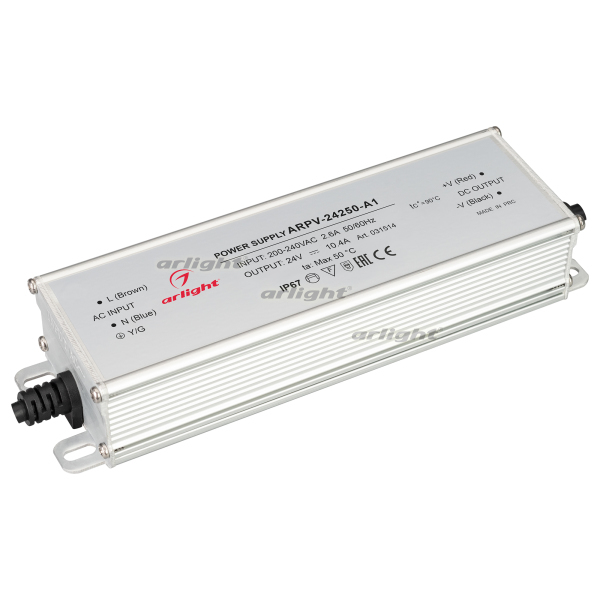 Источник напряжения с гальванической развязкой для светодиодных изделий. Входное напряжение 200-240 VAC. Выходные параметры: 24 В, 10.4 А, 250 Вт. Герметичный алюминиевый корпус IP 67. Рабочая температура -40… 70C°. Габаритные размеры длина 192 мм, ширина 56 мм, высота 36 мм. Гарантийный срок 3 года.