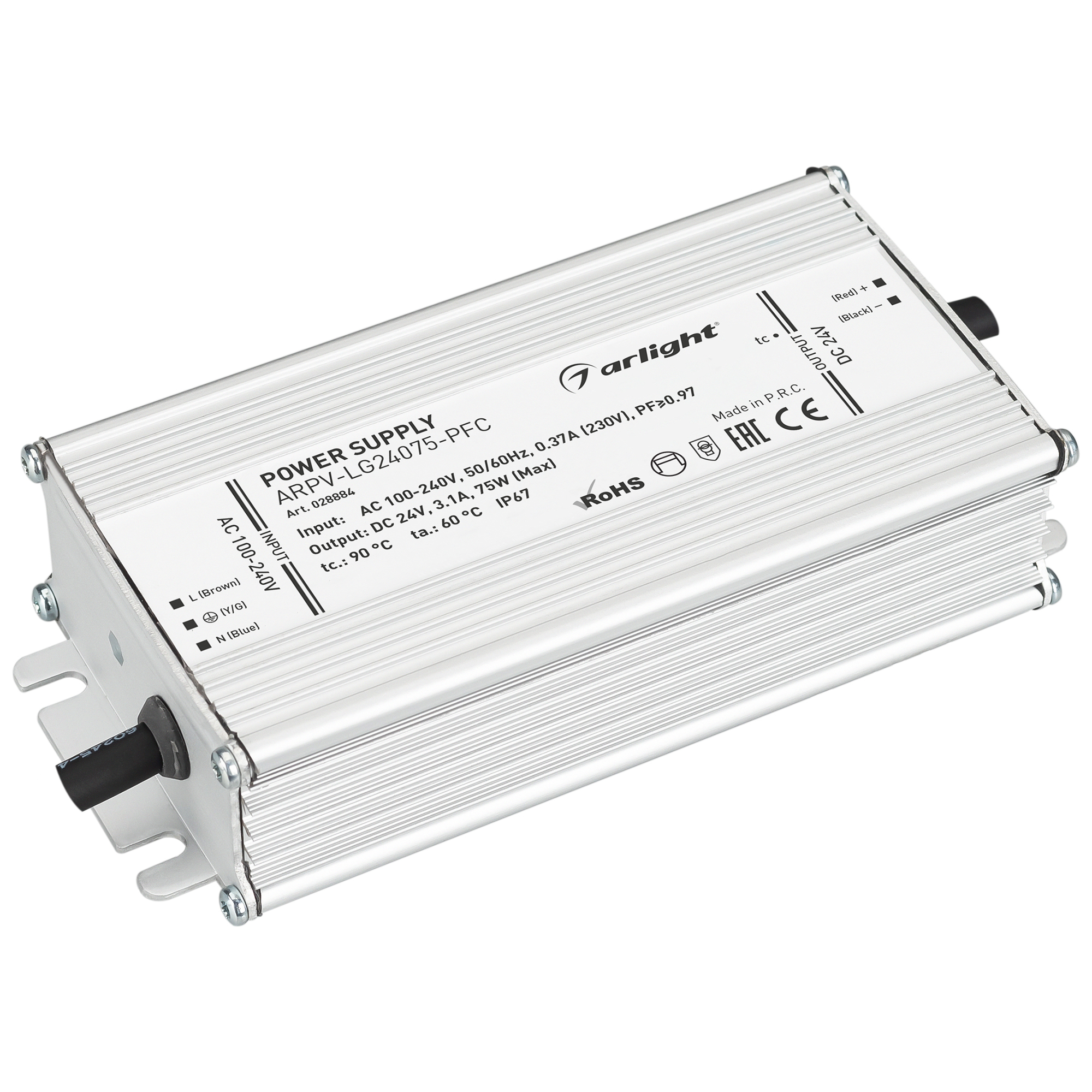 Источник напряжения с гальванической развязкой для светодиодных изделий. Входное напряжение 200-240 VAC. Выходные параметры: 24 В, 3.1 А, 75 Вт. Встроенный PFC >0.95. Герметичный алюминиевый корпус IP 67. Рабочая температура -40…+70C°. Габаритные размеры длина 150 мм, ширина 70 мм, высота 33.5 мм. Гарантийный срок 5 лет.