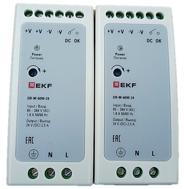 Блоки питания серии DR напряжениями 5/12/24/48 В, EKF устанавливаются на DIN рейку и предназначены для преобразования входного переменного напряжения 100-240 В в постоянное стабилизированное напряжение 5,12,24 или 48 Вольт.