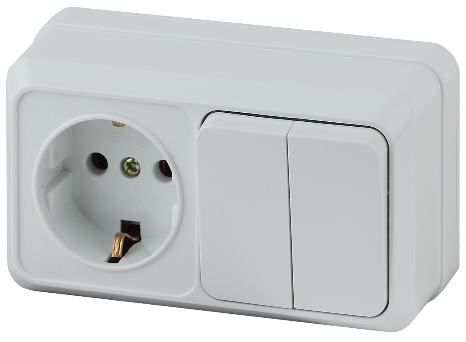 Белый Блок розетка с/з + выкл. 2-кл горизонтальный 10(16)А-250В, IP20,2-702-01