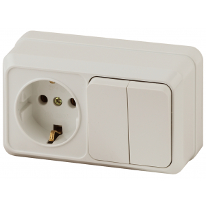 Блок розетка с выключателем горизонтальный серии Intro Quadro открытой установки цвет слоновая кость 2-702-02. Номинальные характеристики 10(16)А-250В. Устройство выполнено из термопласта, керамики, стали и латуни, оснащено винтовыми зажимами.