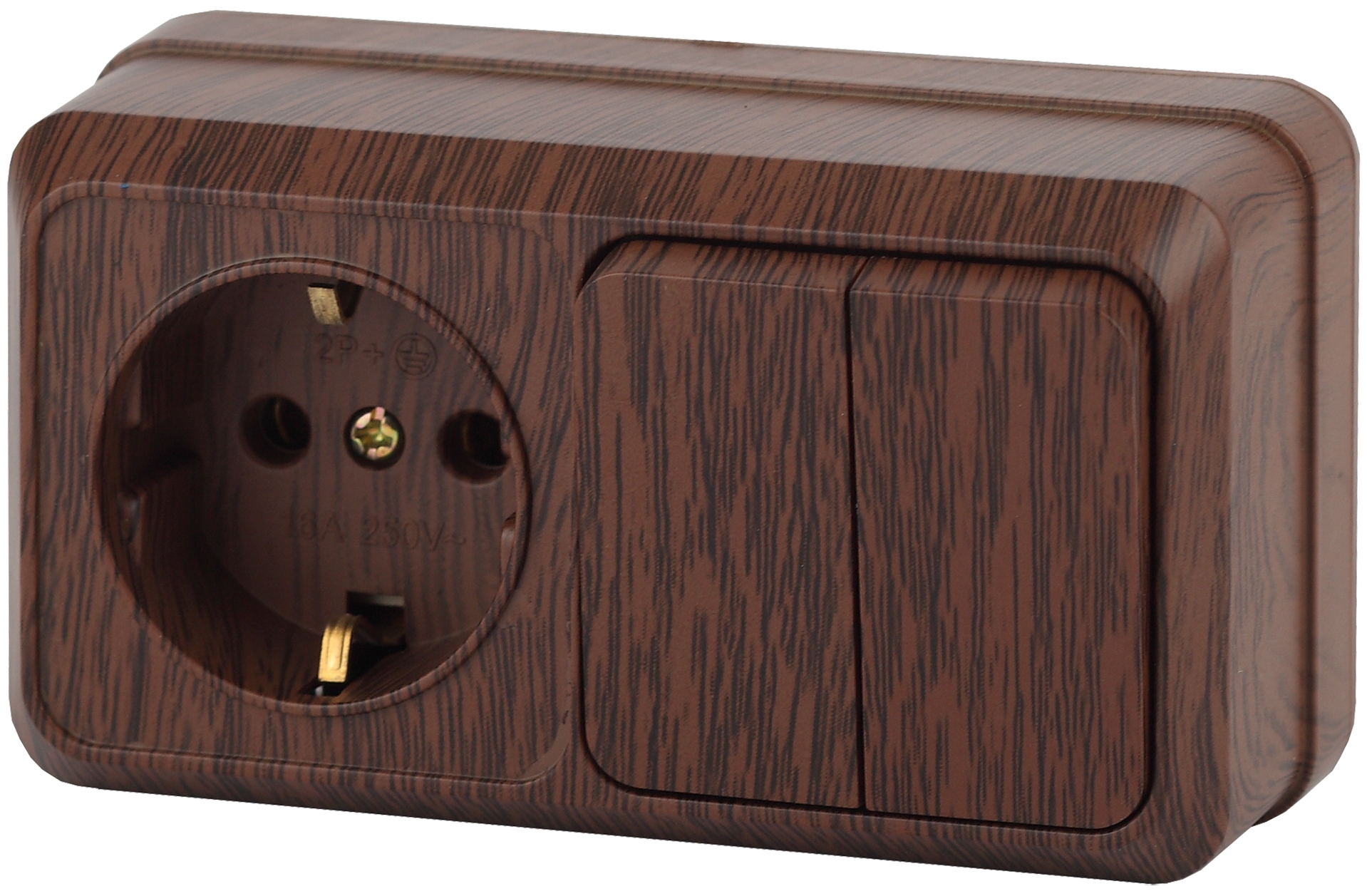 Блок розетка с выключателем горизонтальный серии Intro Quadro открытой установки цвет венге 2-702-10. Номинальные характеристики 10(16)А-250В. Устройство выполнено из термопласта, керамики, стали и латуни, оснащено винтовыми зажимами.