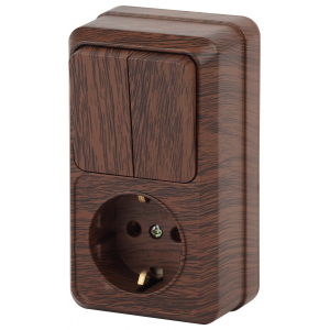 Блок розетка с выключателем вертикальный серии Intro Quadro открытой установки цвет венге 2-706-10. Номинальные характеристики 10(16)А-250В. Устройство выполнено из термопласта, керамики, стали и латуни, оснащено винтовыми зажимами.