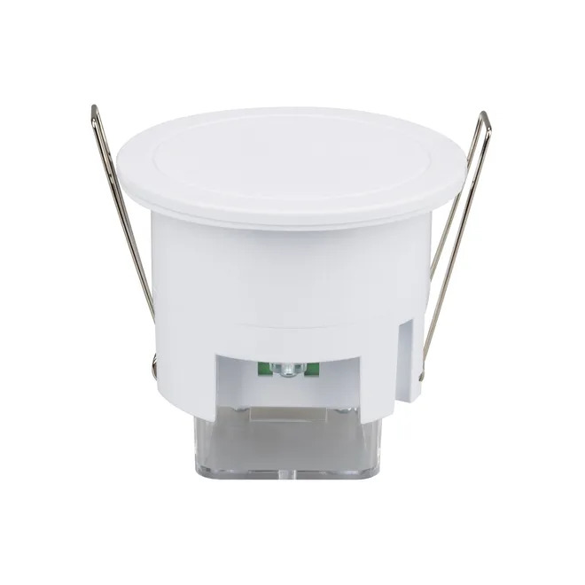 Микроволновый датчик присутствия, совмещенный с датчиком освещенности. Высота установки - 2 - 4 м. Угол обнаружения 360°. Может срабатывать через двери и тонкие стены. Настройки: время отключения (10 c – 12 мин), радиус зоны срабатывания (до 3 м), освещенность (3 - 2000 люкс). Максимальная нагрузка 2000 Вт (для ламп накал-я и галогенных), 1000 Вт (для светодиодных ламп), размеры (DxH) - 76x66,2 мм. Размер для встройки 62мм.
