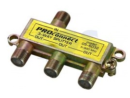 Данный ТВ сплиттер рассчитан под F разъем и имеет три выxода, т. е. сигнал, проxодящий через сплиттер, делится на три части. Кабель подключается к этому делителю с помощью F-разъемов.