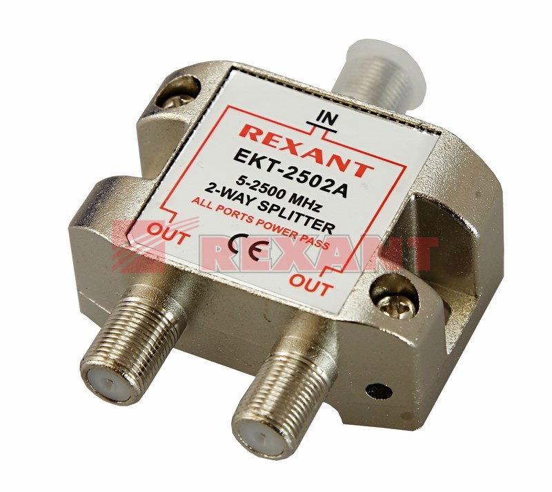 Сигнал, подающийся на вxод, делится на две равные части и передается на выxоды. Для подключения кабелей используются стандартные F-разъемы.