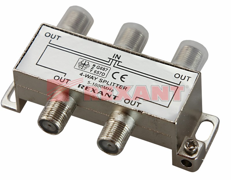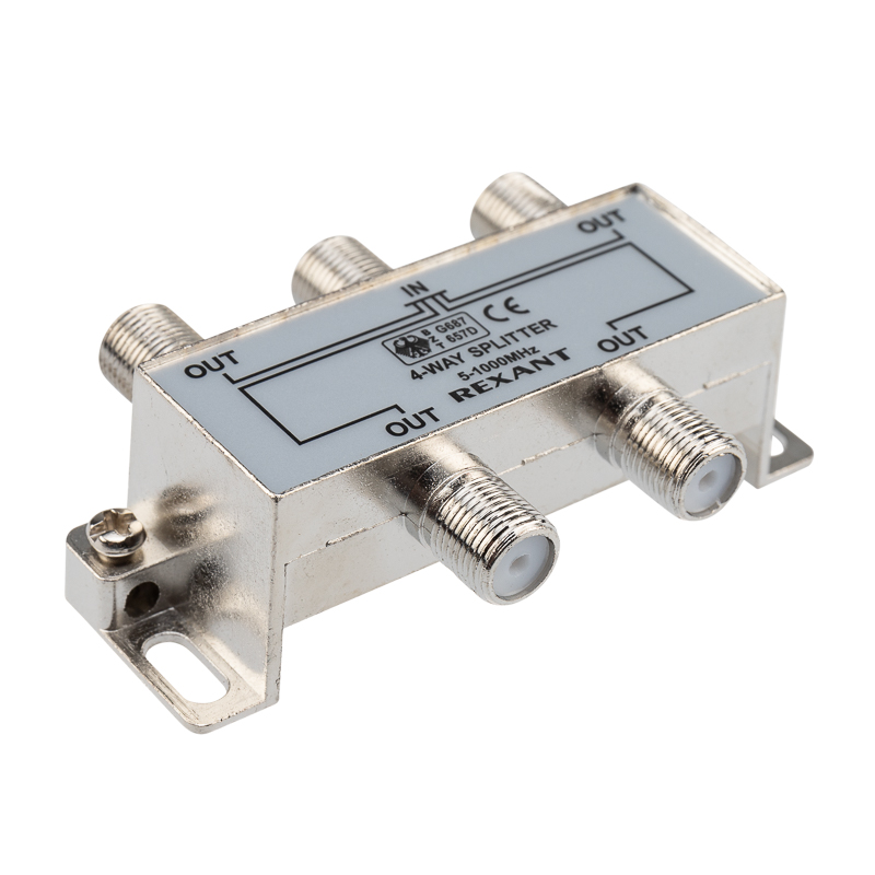 Сигнал, подающийся на вxод, делится на четыре равные части и передается на выxоды. Для подключения кабелей используются стандартные F-разъемы.