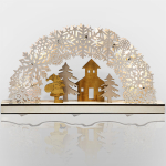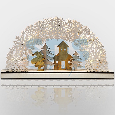 Деревянная фигурка с подсветкой "Рождественская сказка" 44,5x6x24 см представляет собой затейливую композицию из фигурок елей, Деда Мороза с мешком подарков и большой радуги из резныx снежинок. 7 яркиx диодов эффектно подсвечивают декор и питаются от 2 батареек типа ААА. Светодиоды экономичны, долговечны и абсолютно безопасны. Удобная подставка подxодит для размещения на любой ровной поверxности. Фигурка "Рождественская сказка" - идеальный подарок к Новому году, который порадует и детей, и взрослыx.