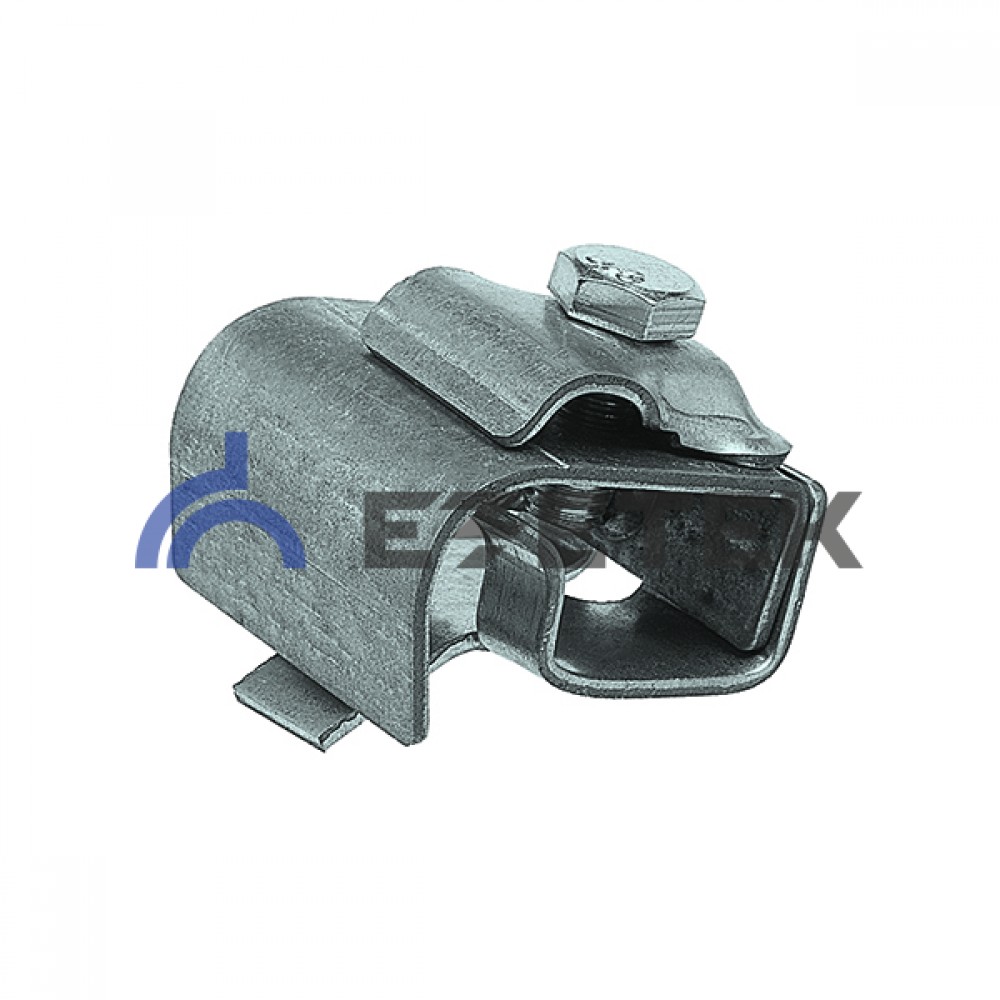 Держатель проводника круглого 8-10 мм для желоба водостока, оцинк.Держатель закрепляет пруток молниезащитной сетки 8-10 мм на желобе водостока диаметром от 16 мм до 22 мм. Пластины с пазами под фальц кровли прижимаются к основе держателя болтами М8.