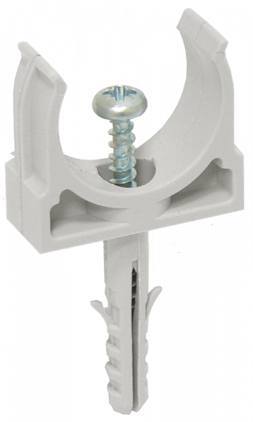 Держатель с защелкой и дюбелем СТ предназначен для крепления трубы. В комплекте держателя уже имеется дюбель с саморезом.