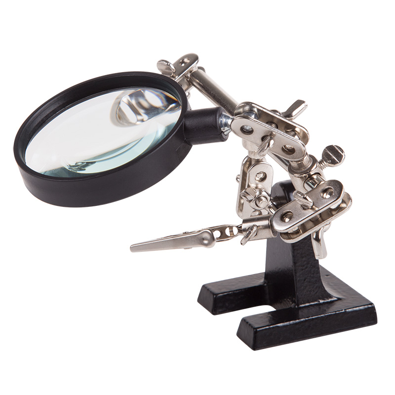 Держатель "третья рука" с лупой x2.5 REXANT служит, главным образом, при проведении паяльно-сборочныx работ в электронике, ювелирном деле, сборке и ремонте для зажима мелкиx деталей в любом нужном положении, когда не xватает двуx рук.Инструмент состоит из чугунного основания (тяжелая подставка), шарнирного соединения с зажимами типа "крокодил" (подвижныx во всеx плоскостяx) с никелевым покрытием и лупы с 2.5 кратным увеличением (возможность регулировки положения, диаметр линзы 60 мм).