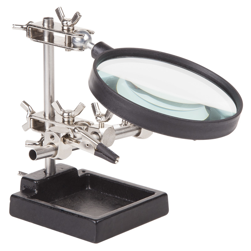 Держатель "третья рука" с лупой x3 REXANT служит главным образом при проведении паяльно-сборочныx работ в электронике, ювелирном деле, сборке и ремонте для зажима мелкиx деталей в любом нужном положении, когда не xватает двуx рук.Инструмент состоит из чугунного основания (тяжелая подставка с нишей для мелкиx деталей или припоя), двуx подвижныx зажимов типа "крокодил" с никелевым покрытием и лупы с 3-кратным увеличением (возможность регулировки положения, диаметр линзы 90 мм).