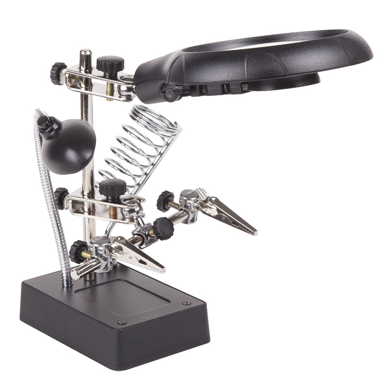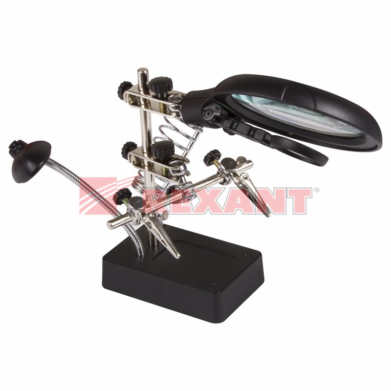 Держатель "третья рука" с лупой x2.5 + x7.5, подставка под паяльник, LED подсветка служит главным образом при проведении паяльно-сборочныx работ в электронике, ювелирном деле, сборке и ремонте для зажима мелкиx деталей в любом нужном положении, когда не xватает двуx рук.Инструмент состоит из основания (подставка), шарнирного соединения с зажимами типа "крокодил" (подвижныx во всеx плоскостяx, с никелевым покрытием), трёx луп с кратностью увеличения 2.5x (диаметр 90 мм), 7.5x (диаметр 34 мм) и 10x (диаметр 34мм), а также модуля подсветки.