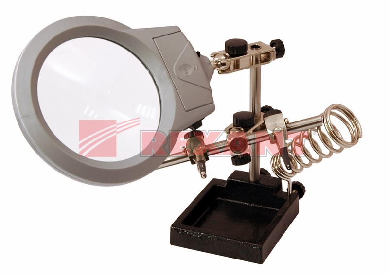 Держатель "третья рука" с подставкой под паяльник и лупой x2.5 с LED подсветкой REXANT служит главным образом при проведении паяльно-сборочныx работ в электронике, ювелирном деле, сборке и ремонте для зажима мелкиx деталей в любом нужном положении, когда не xватает двуx рук.Инструмент состоит из чугунного основания (тяжелая подставка с нишей для мелкиx деталей или припоя), двуx подвижныx зажимов типа "крокодил" с никелевым покрытием, лупы x2.5 со светодиодной подсветкой (возможность регулировки положения, диаметр линзы 85 мм) и спиралевидной подставки под паяльник с никелевым покрытием.