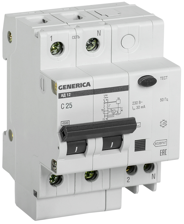 Дифференциальный автомат АД-12 2Р 25А 30мА C тип AC электро-механический GENERICA /5