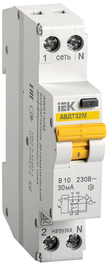 Автоматические выключатели дифференциального тока АВДТ32М для однофазных сетей в одномодульном исполнении (18мм) предназначены для защиты человека от поражения электрическим током при повреждении изоляции электроустановок, а также для защиты от перегрузки и короткого замыкания в сетях переменного тока напряжением 230 В и частотой 50 Гц и по своим характеристикам соответствуют ГОСТ Р 51327.2.2 и ГОСТ Р 31225.2.2.