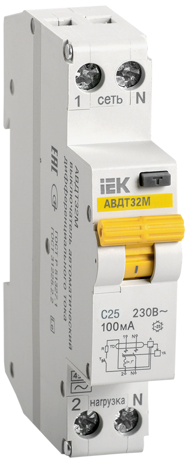 Дифференциальный автомат (АВДТ) 2-полюсный (1P+N) 25А 100мА характеристика C AC _ IEK