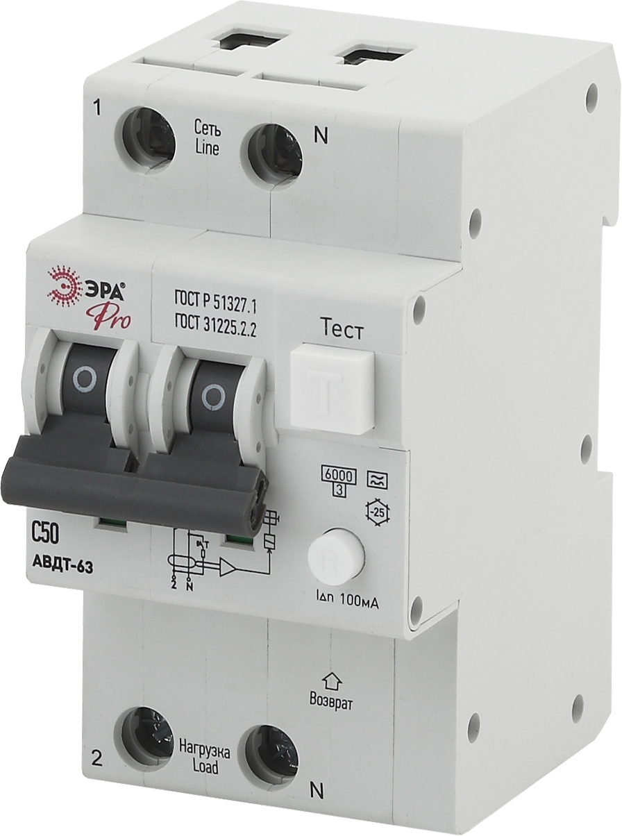 Дифференциальный автомат (АВДТ) 2-полюсный (1P+N) 50А 100мА характеристика C A _ ЭРА