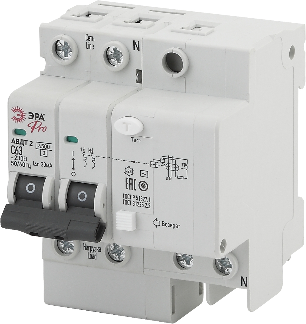 Дифференциальный автомат (АВДТ) 2-полюсный (1P+N) 63А 30мА характеристика C AC _ ЭРА