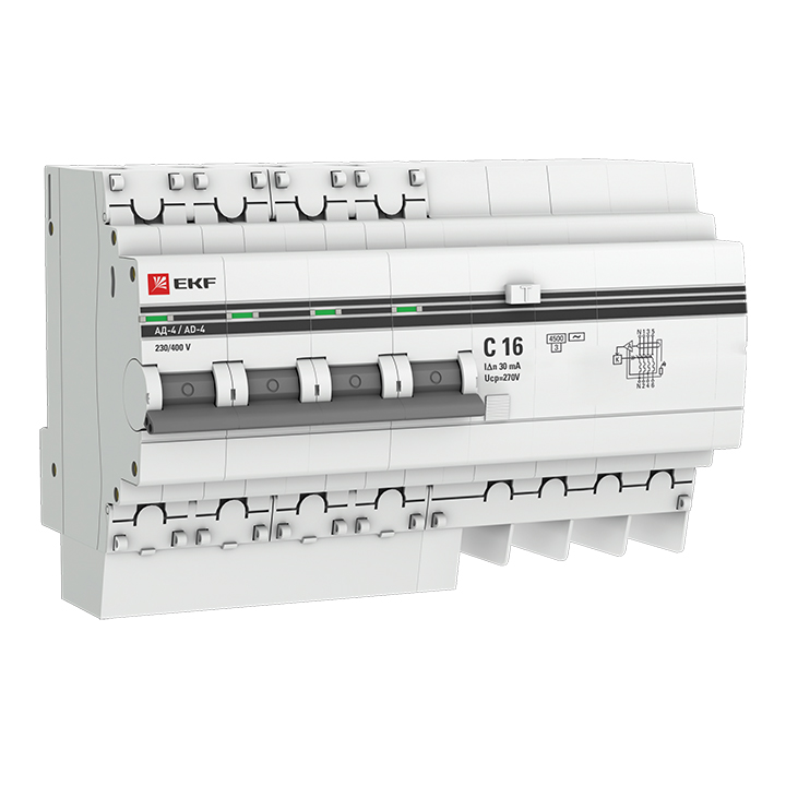 Дифференциальный автоматический выключатель АД-2(4) (S) EKF PROxima представляет собой аппарат, сочетающий функции автоматического выключателя с устройством защитного отключения. При обнаружении автоматическим выключателем в защищаемом участке сети тока утечки (повреждения) на землю или сверхтока (тока перегрузки или короткого замыкания) происходит срабатывание устройства, приводящее к отключению защищаемой сети. Особое отличие дифференциальных автоматов EKF – в наличии встроенного блока защиты от перенапряжения. АД-2 и АД-4 EKF PROxima выпускаются в стандартном и селективном (АД-2S, АД-4S) исполнениях.